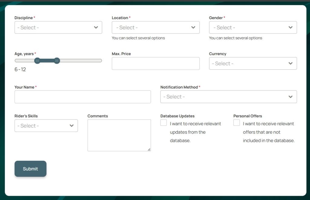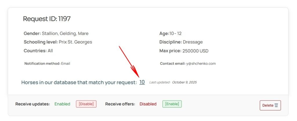 If you have created an account on HORSES.SALE, your request will appear in your dashboard, where you can review the details and confirm their accuracy. If you do not have an account, you will receive a confirmation email containing the same information. In both cases, you will be shown the number of horses that currently match your request, allowing you to decide whether purchasing database access is worthwhile.