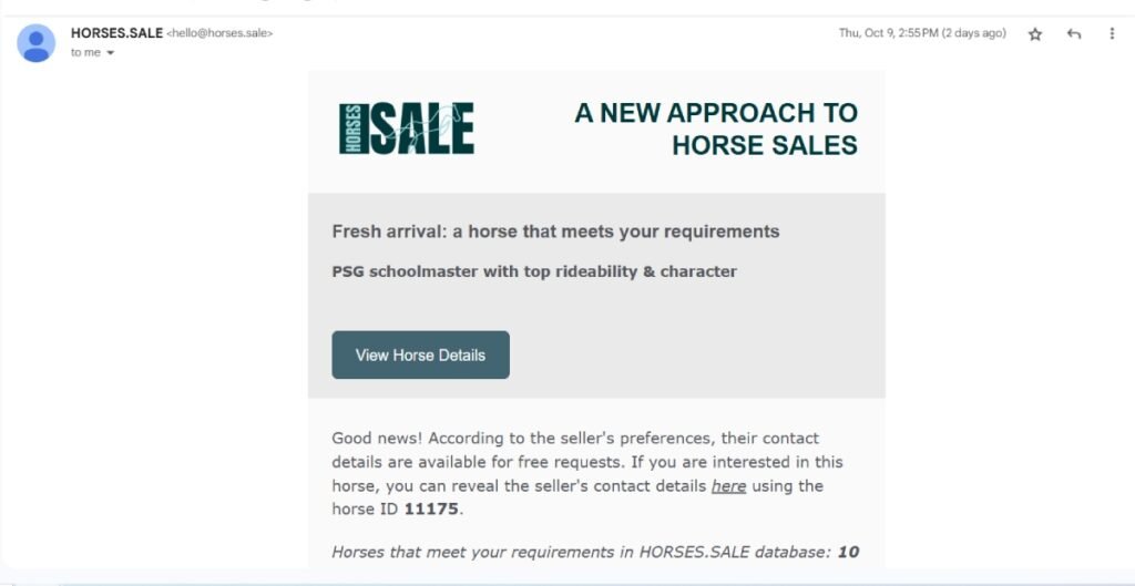 Step 2. Once a new horse meeting your criteria appears in the database, you will receive an automatic notification. Each notification includes a link to view the horse’s full details.