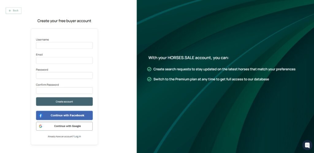 Step 1. To purchase database access, first create a free account. HORSES.SALE supports quick authorization through Google and Facebook, allowing you to register in just a few seconds.