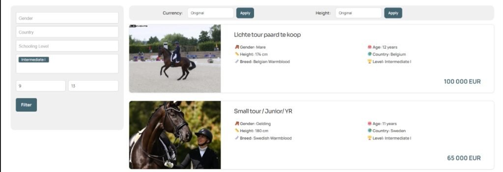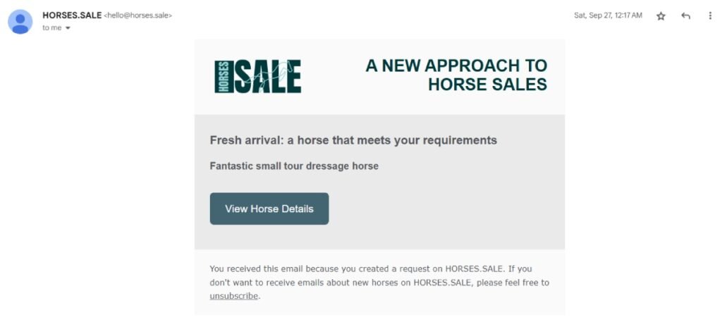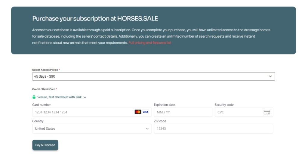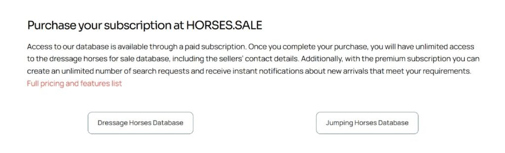 HORSES.SALE offers time-limited access to its complete horse database. Access can be purchased for 3, 90, or 180 days. During the active subscription period, you can view all listings in full, including detailed information about each horse and the seller’s contact details. You can also create an unlimited number of horse search requests to receive notifications about new arrivals that match your preferences.