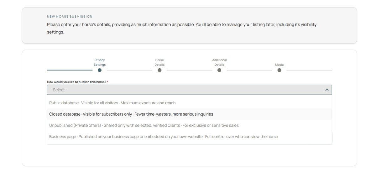 When this option is selected, the horse is published in the Closed Database, which is accessible only to registered buyers with paid access.