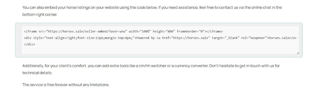 A Personal Page is your own webpage on HORSES.SALE, where you can present your horses online. It is entirely free to use, contains no external links, and has no usage limitations. You can easily add the horse presentation widget to your website as an iframe.