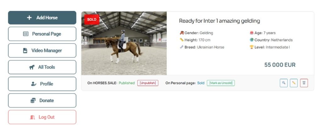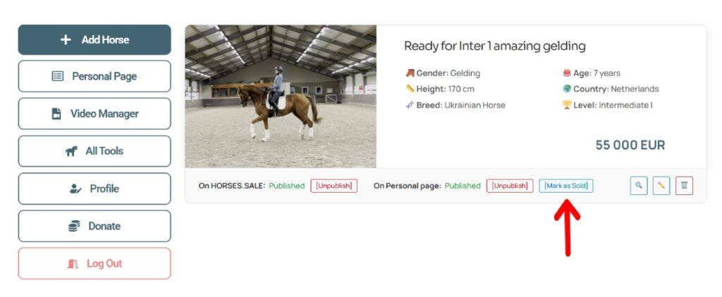 Step 3 (optional). Mark horses as sold. If you want to display sold horses on your page, click “Mark as Sold” A “Sold” badge will appear on the horse’s main photo.