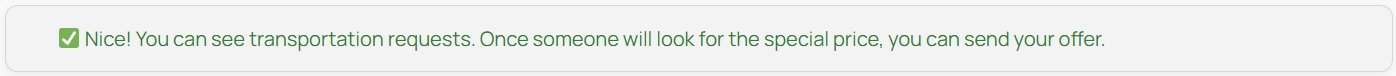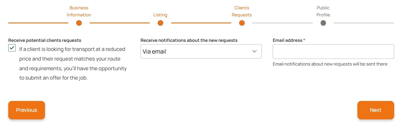 Transport requests are a great opportunity to contact potential clients directly, especially if you are ready to offer a special price for this route. To make the requests tool active for you, specify a contact email or phone number in your business profile during setup. These details will be displayed for customers to reach you.
