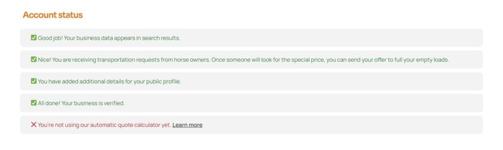 At the top of your dashboard, you will find an overview of the Move Your Horse features currently active for your account. If some features are not yet enabled, you can complete the required setup steps later to make full use of all available opportunities and achieve the best results on the platform.