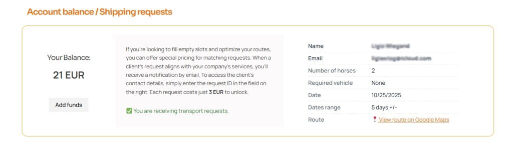 If the User Requests feature is activated for your account, you will receive notifications about transport requests that match your business profile. Each email notification includes a Request ID. If you are interested in a particular request and wish to make an offer, enter the Request ID in your dashboard to view the client’s contact details. You can then discuss transportation details directly with the client if they confirm their interest.